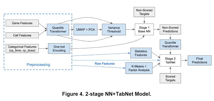 추가로 살펴볼 만한 언급도 있습니다. 아래의 TabNet이 사용된 모델의 전체 구조를 보시면 Stage 2에서 TabNet이 사용되고 Stage 1은 TabNet이 아닌 다른 NN이 사용되었습니다. 이에 대해 저자들은 TabNet이 non-scored predictions 부분에서 좋은 결과를 내지 못해 제외했다고 언급합니다[13].