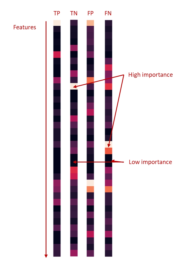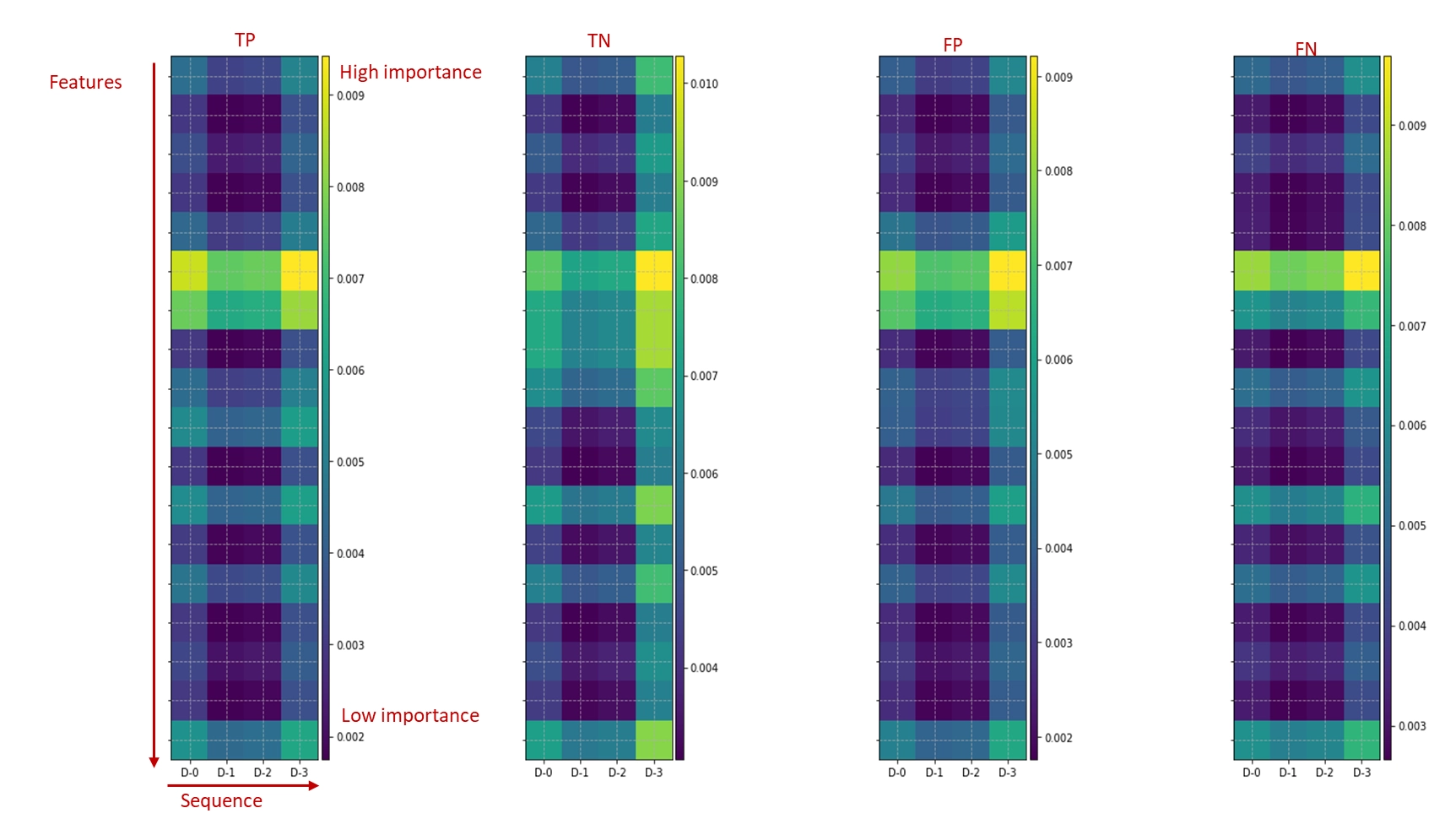 특히 instance-wise feature selection에서 만족스러운 결과를 보여주었습니다. 아래는 GradCAM[14]으로 CNN(v2)의 예측에 기여가 높은(이후 feature importance로 설명) 노드를 시각화한 자료입니다. 그림의 세로축은 features, 가로축은 거래의 sequence입니다. 셀의 색상이 밝을수록 높은 중요도를 갖고 있다고 볼 수 있는데 생각보다 TP, TN, FP, FN에서 시각적으로 별다른 차이가 관찰되지 않았습니다. 원인은 기여도가 높은 feature가 각 sequence마다 반복적으로 선택되었기 때문으로 추정됩니다.