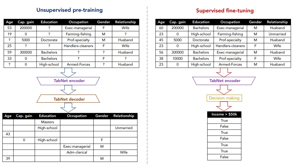 TabNet은 2019년 발표와 함께 GCP의 built-in 알고리즘으로 적용된 정형 데이터에 특화된 딥러닝 모델입니다. 정형 데이터에서 DT(Decision tree)-based 모델과 DNNs(Deep neural networks)의 장점은 계승하고 단점은 제거하고자 했습니다. Sparse feature selection을 통해 핵심 feature에 집중하고 interpretability를 확보했습니다. 또한 다수의 정형 데이터셋에서 안정적으로 높은 성능을 보이는 것과 self-supervised learning으로 레이블이 모자란 데이터셋에서 성능을 크게 향상시킬 수 있음을 실험을 통해 증명했습니다[1].