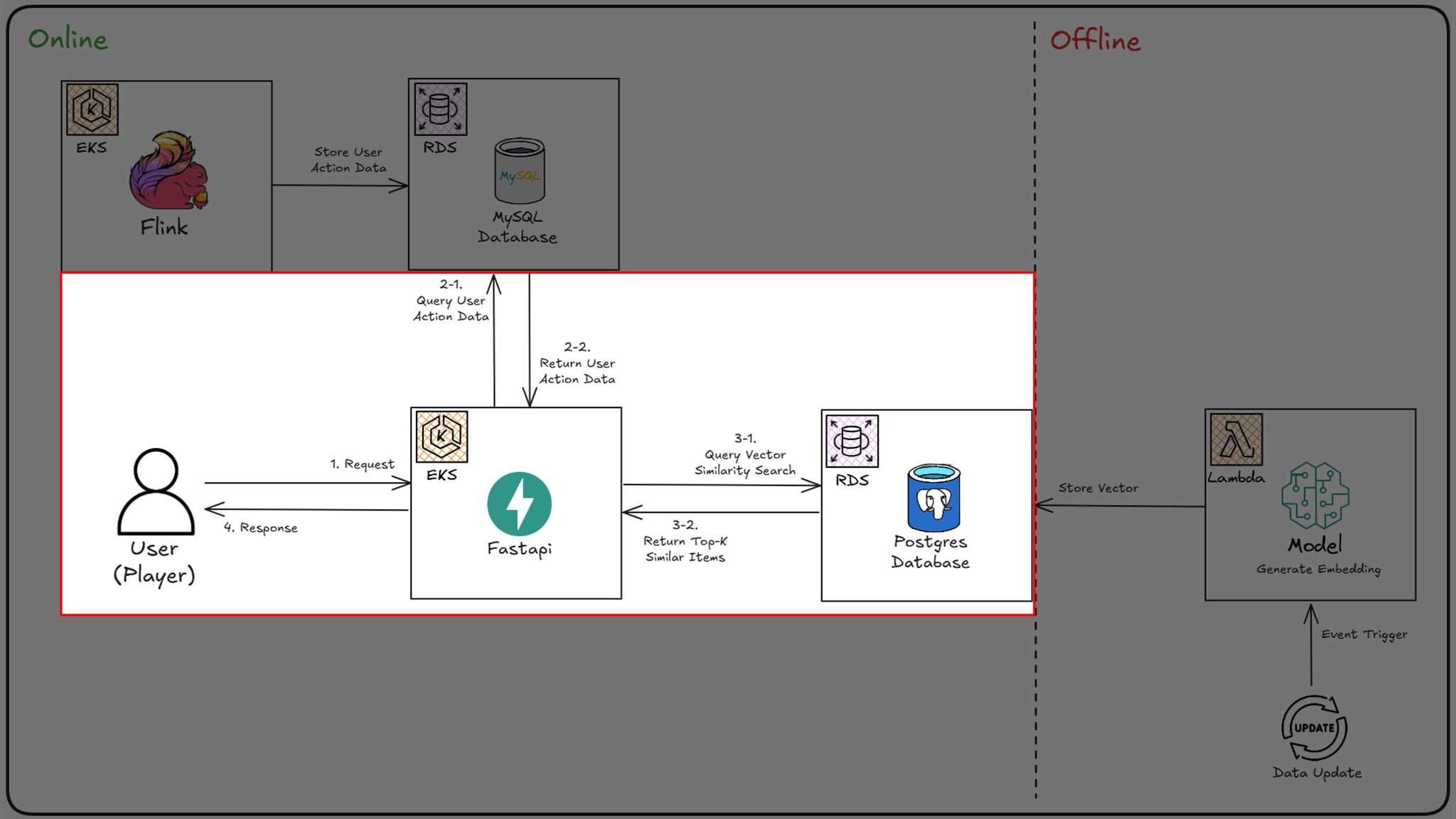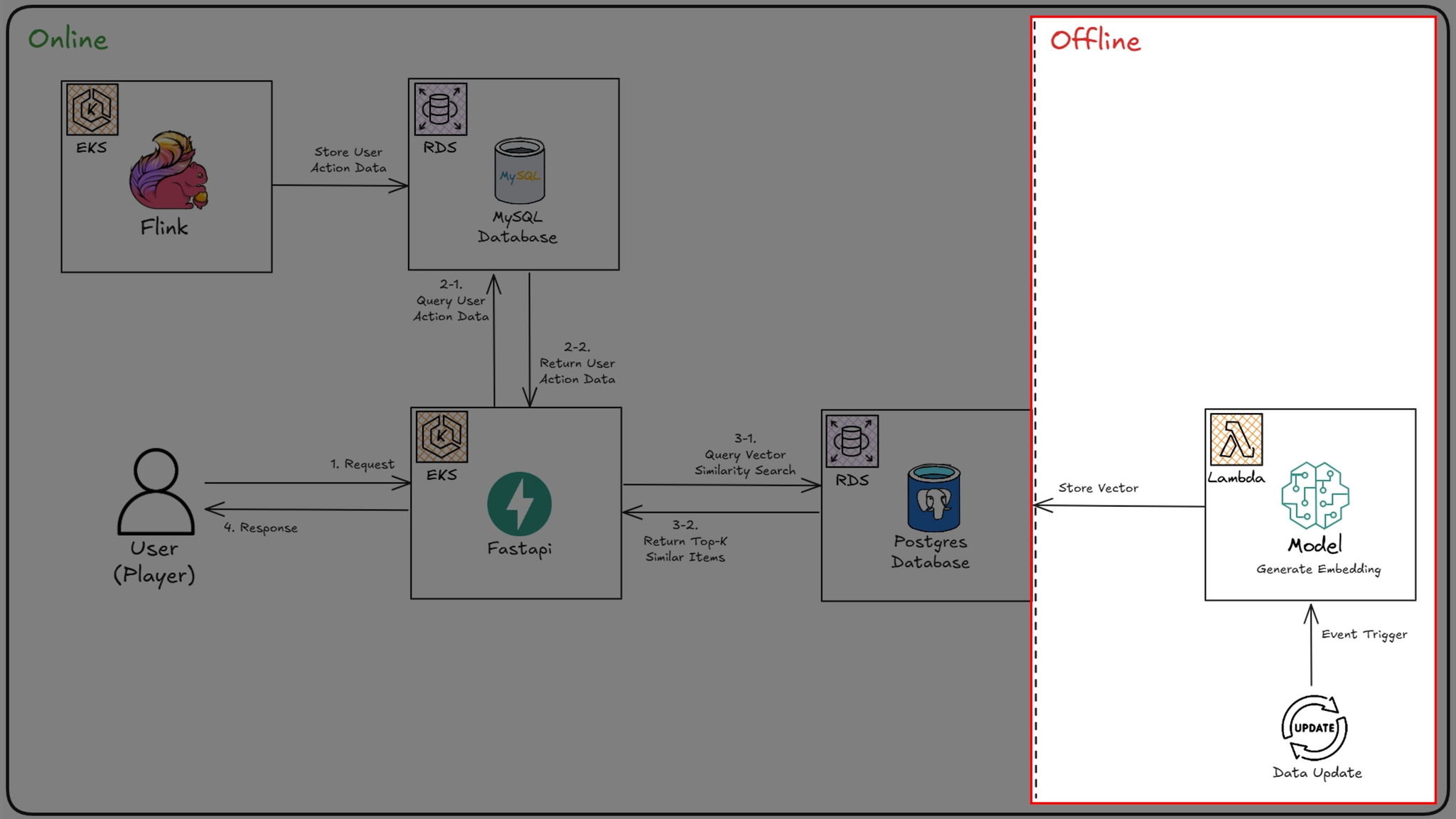 서비스 관점에서 아키텍처는 Offline과 Online 두 가지 흐름으로 나뉩니다. 각 구성은 서로 보완적인 역할을 하며, 정적인 콘텐츠 변화와 동적인 유저 행동 변화에 유연하게 대응하도록 설계되었습니다.