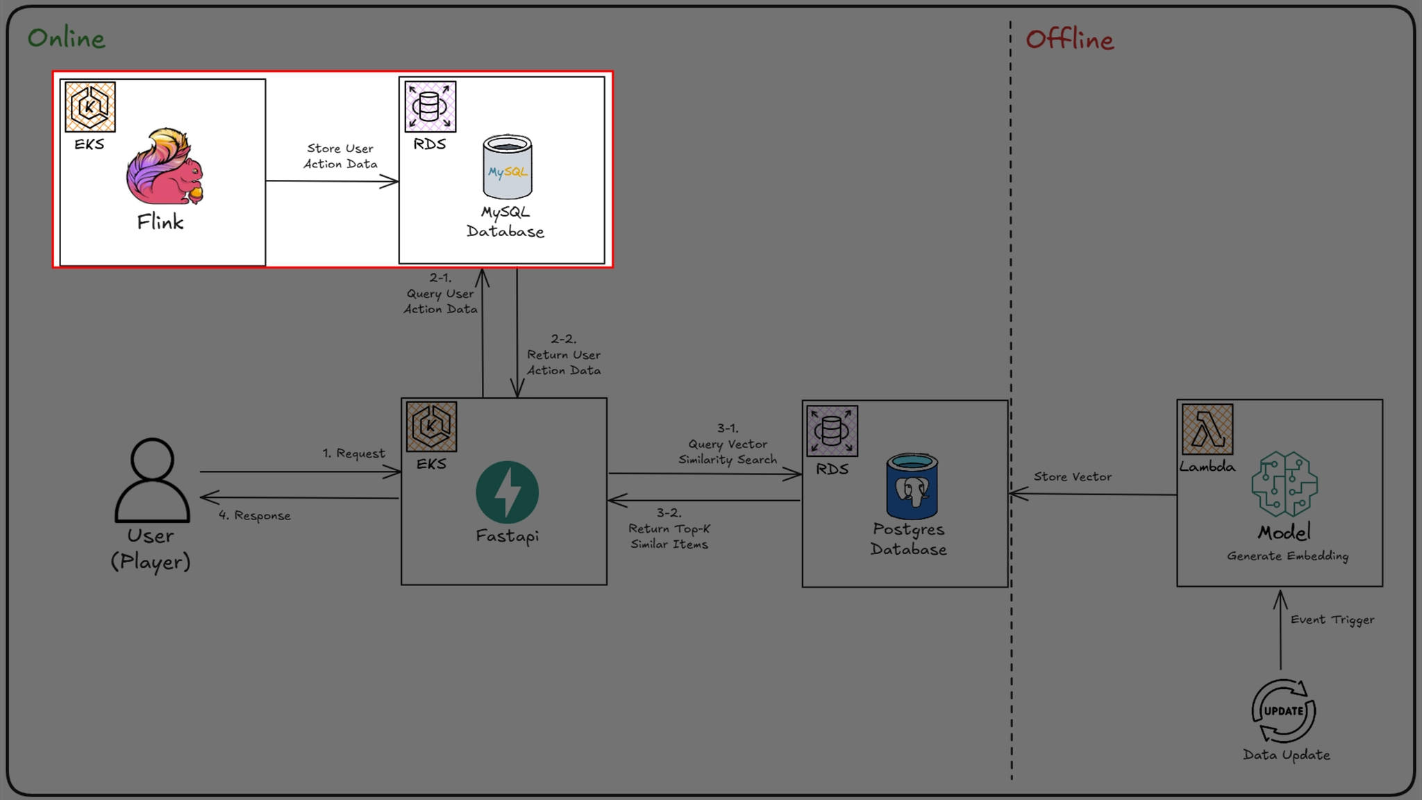 실시간으로 수집되는 유저의 액션 데이터(클릭, 검색, 구매, 장착 등)를 기반으로, 유저의 최신 선호와 맥락에 맞는 아이템을 동적으로 추천합니다. 정적인 추천이 아닌, 유저의 현재 상태에 최적화된 개인화 경험을 제공함으로써 추천의 품질과 몰입감을 동시에 높입니다.