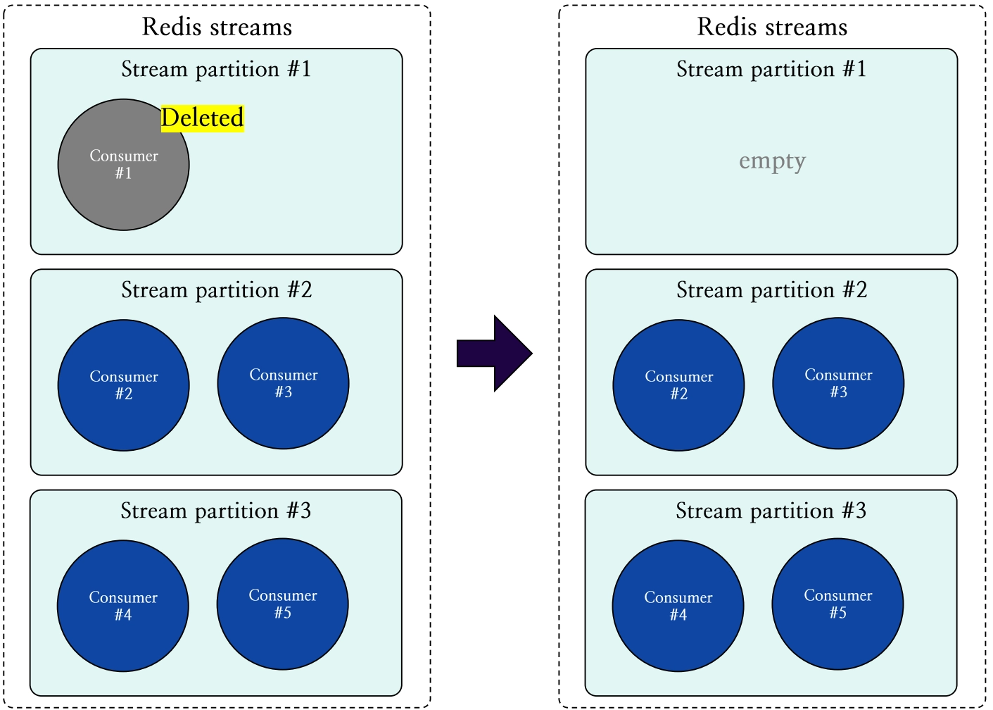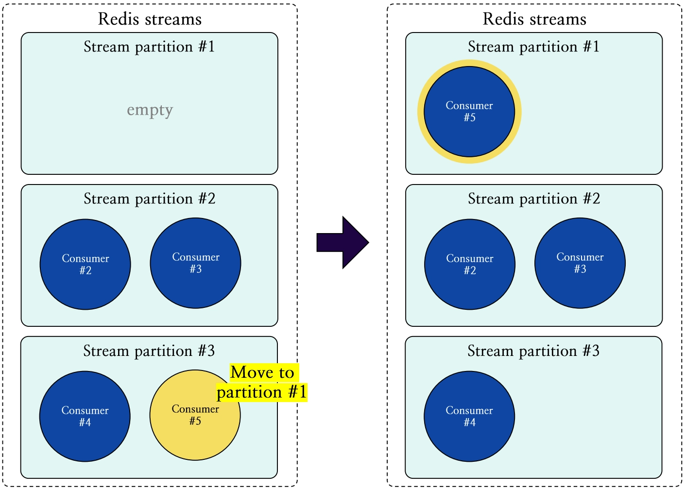 그림 14. 가장 큰 스트림 파티션 내 컨슈머의 가장 작은 파티션으로의 이동 과정 도식화
