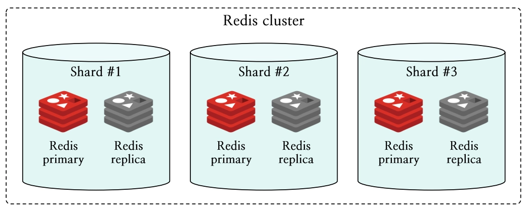 Redis Cluster는 여러 Redis 노드로 구성된 분산 데이터베이스 시스템입니다. Redis Cluster는 데이터 분산 및 확장성을 위해 데이터를 논리적으로 그룹화한 단위인 샤드 (shard)로 이루어져 있습니다. 샤드는 하나 이상의 노드로 구성되며, 노드는 다시 한 대의 프라이머리 노드 (primary node)와 여러 대의 레플리카 노드 (replica node)로 구분할 수 있습니다.
