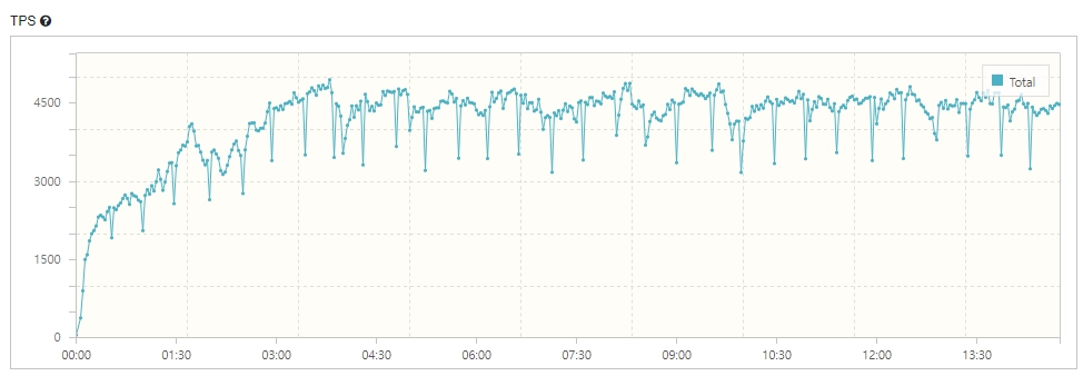 15대의 nGrinder 에이전트에서 1,920명의 유저가 15분 동안 호출한 결과, 총 3,728,978건의 호출이 발생했으며, TPS는 평균 4,134건, 최대 4,940건으로 집계되었습니다. 그림 17은 15분 동안 가해진 호출의 TPS 추이를 나타냅니다.
