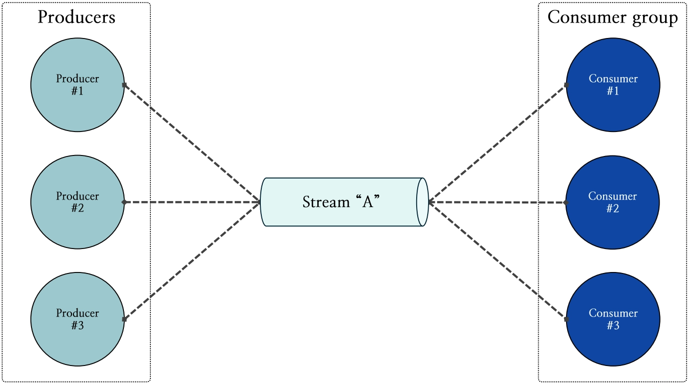 하나의 스트림에는 다수의 프로듀서와 컨슈머가 메시지를 주고받을 수 있습니다. 또한, 컨슈머 그룹을 생성함으로써 그룹 내 컨슈머들은 메시지를 병렬적으로, 그리고 중복 없이 처리할 수 있습니다. 사용자는 Redis SPAR 내부의 동작 방식을 알 필요 없이 하나의 스트림으로 메시지를 주고받을 수 있다고 믿습니다.