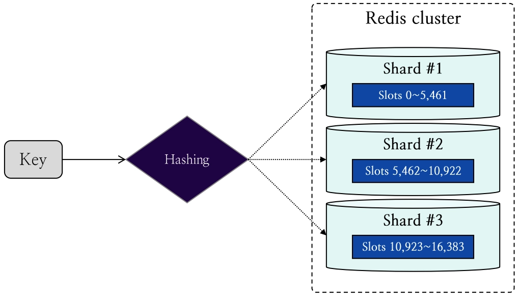 Redis Cluster의 각 키는 해시 함수를 통해 총 16,384개의 가상 공간으로 구성된 슬롯에 매핑됩니다. 실제 데이터는 해당 슬롯을 소유하는 샤드에 저장되고, 이 방식으로 데이터를 여러 샤드에 분산시킴으로써 처리 성능과 확장성을 향상시킬 수 있습니다.