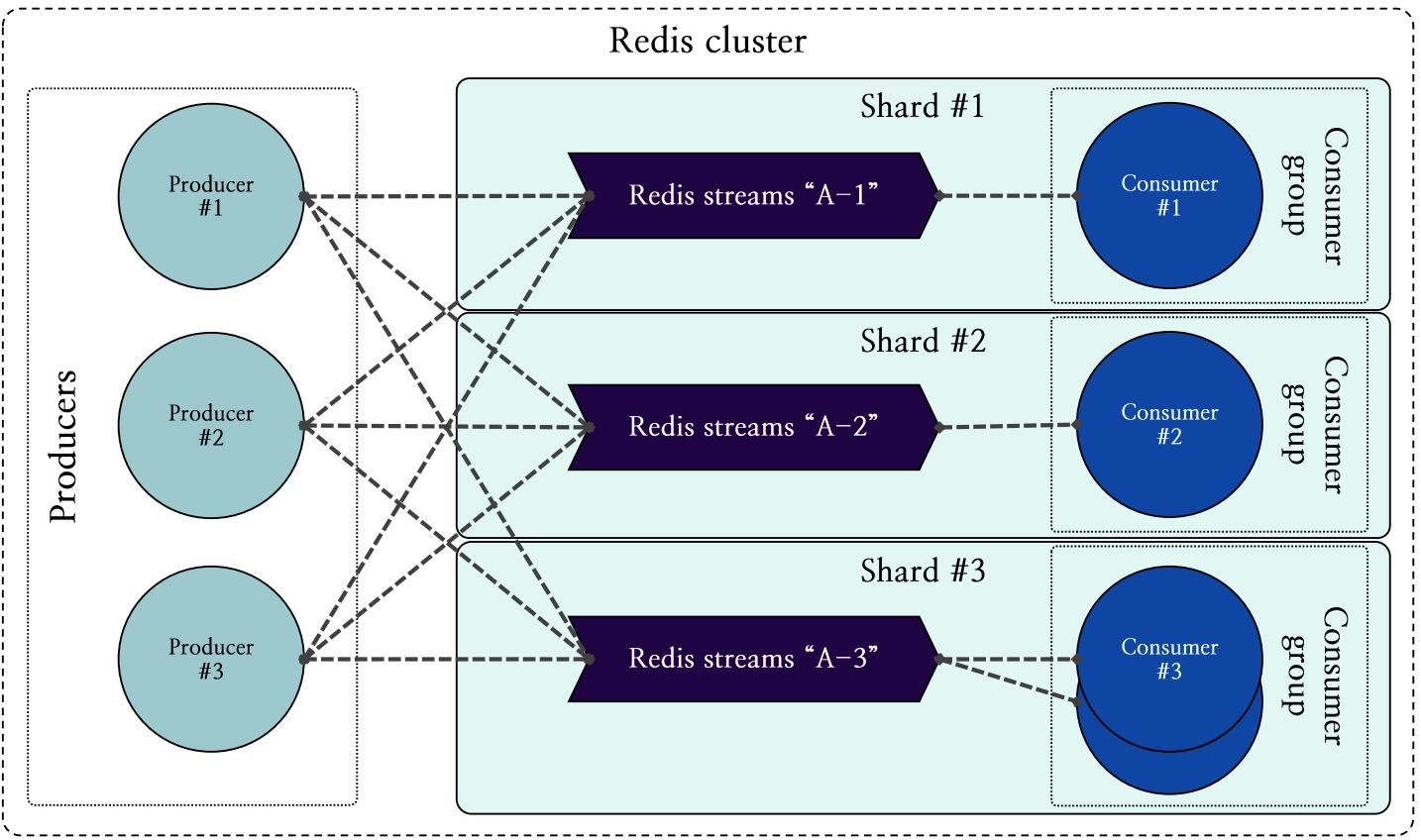 동일한 키는 항상 동일한 샤드에서 처리된다는 Redis의 규칙 때문에, Redis Cluster 환경에서 샤드가 아무리 많더라도 하나의 스트림은 항상 동일한 샤드에서 처리됩니다. 이는 Redis Streams가 현재 확장성을 위한 기능을 갖추지 못한 상태라는 것을 의미합니다.