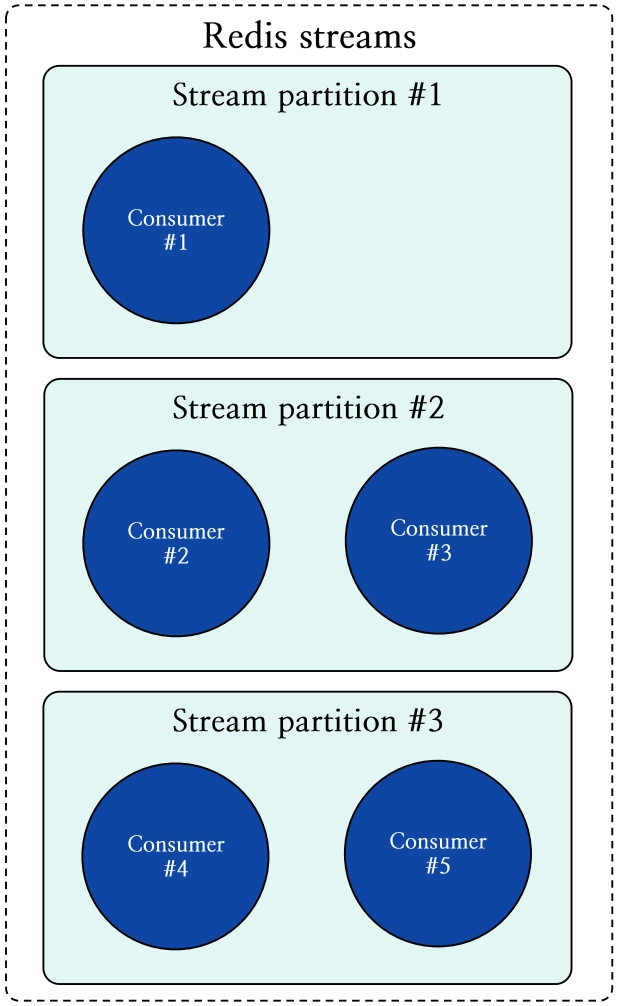 Redis Streams는 여러 컨슈머가 스트림을 공유하면서 메시지를 중복 없이 소비할 수 있도록 컨슈머 그룹 (consumer group)을 지원합니다. 그룹 내의 컨슈머들은 서로 다른 메시지를 처리하며, 동일한 그룹 내에서 메시지 중복 처리가 발생하지 않습니다.