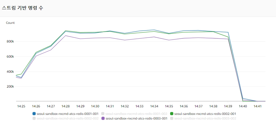 부하 테스트를 진행하는 상황에서 ElastiCache의 시간에 따른 샤드 별 스트림 기반 명령어 호출 수는 그림 18과 같이 나타났습니다.