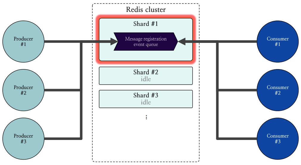 그림과 같이 여러 프로듀서들이 메시지 등록 이벤트 큐가 속한 샤드 #1에 메시지를 등록하고 있고, 여러 컨슈머들이 마찬가지로 샤드 #1로부터 메시지를 가져가고 있습니다. 이로 인해 샤드 #1에만 높은 부하가 발생하게 되며, 샤드 #2, 샤드 #3과 같이 다른 샤드들은 idle 상태에 놓이면서 아무런 부하를 받지 않고 부하의 불균등한 상태가 지속될 수 있습니다.