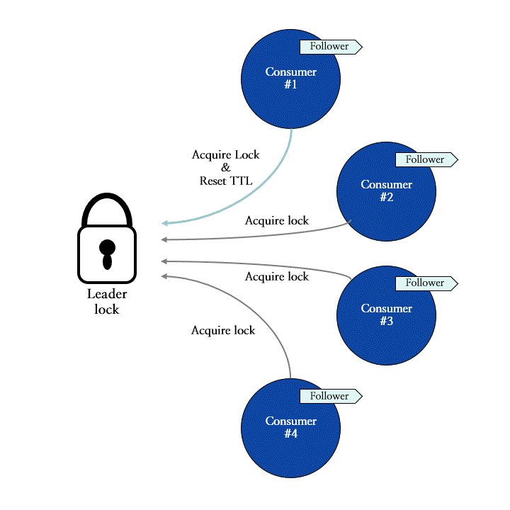 이 메커니즘을 적용한 Redis SPAR에는 리더 컨슈머로서의 자격을 증명해 주는 리더 락 (leader lock)이 존재하며, 모든 컨슈머들은 리더가 되기 위해 리더 락의 획득을 시도합니다. 그림 9는 네 개의 컨슈머들이 리더 락을 획득하는 과정을 나타냅니다. 이 예시에서는 컨슈머 #1이 가장 먼저 락을 획득하여 리더 컨슈머로 선출되었으며, 이후에 요청한 컨슈머들은 리더 락을 획득하는 데 실패한 상황을 묘사합니다.