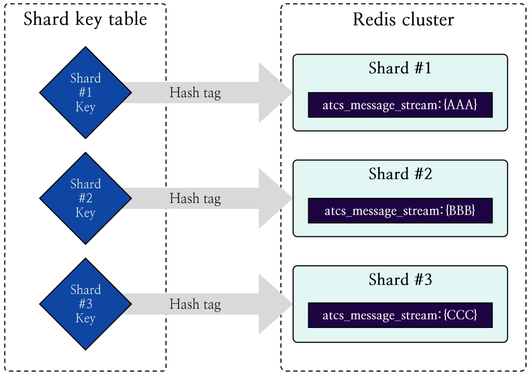 Redis SPAR는 샤드 키를 미리 계산하여 테이블로 보관합니다. 그리고 프로듀서가 메시지를 등록할 때, 또는 컨슈머가 메시지를 가져갈 때, 테이블에서 해당 샤드 키를 가져와 해시 태그와 함께 스트림 키에 추가함으로써 원하는 샤드를 지정할 수 있습니다.