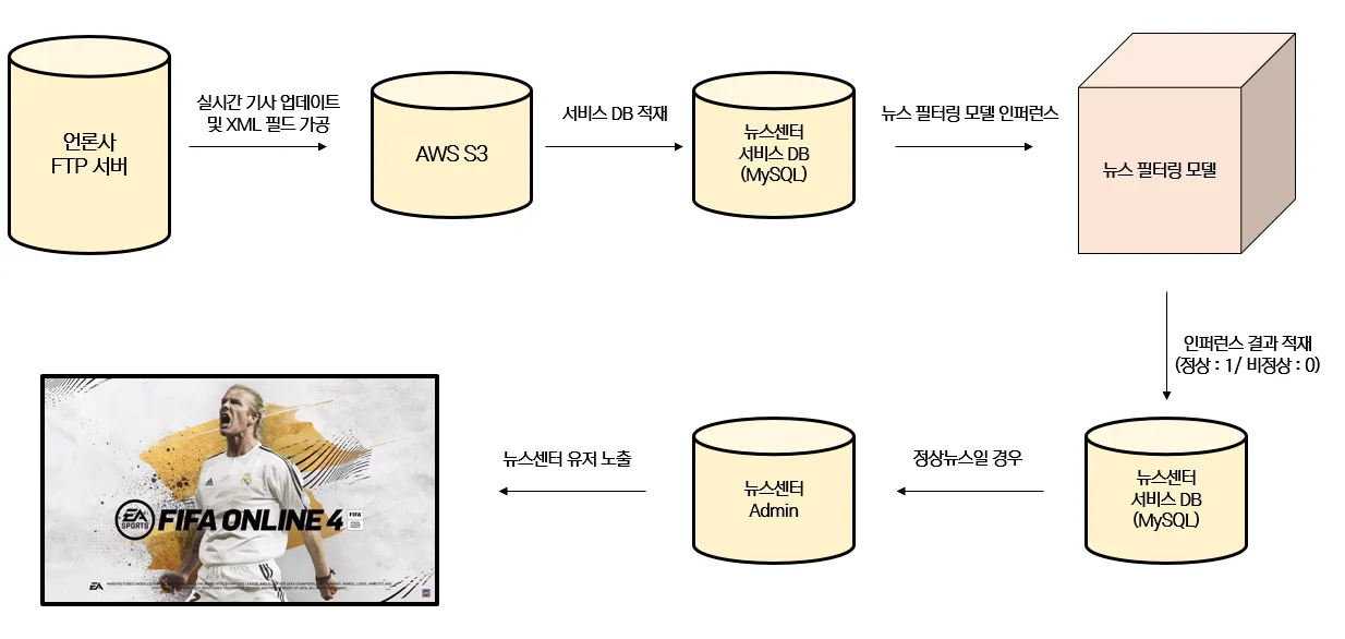 언론사의 FTP 서버를 통해 실시간으로 제공되는 뉴스 기사 중 필요한 필드를 S3에 적재한 후에 서비스 DB로 가져온 뒤 위에 생성된 필터링 모델을 통해 결과를 추론합니다. 결과 추론 결과 정상 뉴스/비정상 뉴스로 이진 분류(1/0)를 진행하는데, 정상 뉴스인 경우(SORT=1)에만 어드민 페이지를 통해 동기화를 진행합니다.