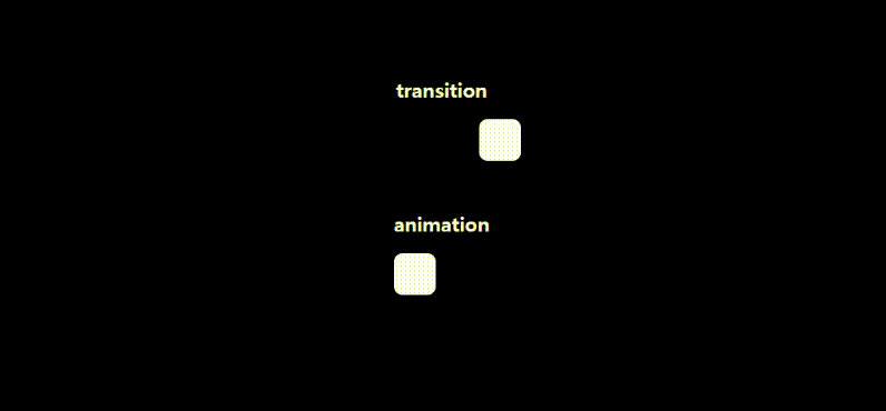 애니메이션은 DOM 요소가 렌더링된 후 자동으로 실행되지만, 트랜지션은 그렇지 않습니다. 트랜지션은 마우스 오버 등의 액션이 발생하거나, 트랜지션 속성이 영향을 미치는 항목이 최초 렌더링된 후 추가되어야만 실행됩니다. 예시에서는 애니메이션과 비교하기 위해 트랜지션이 100ms 뒤에 자동으로 적용되도록 설정했습니다.