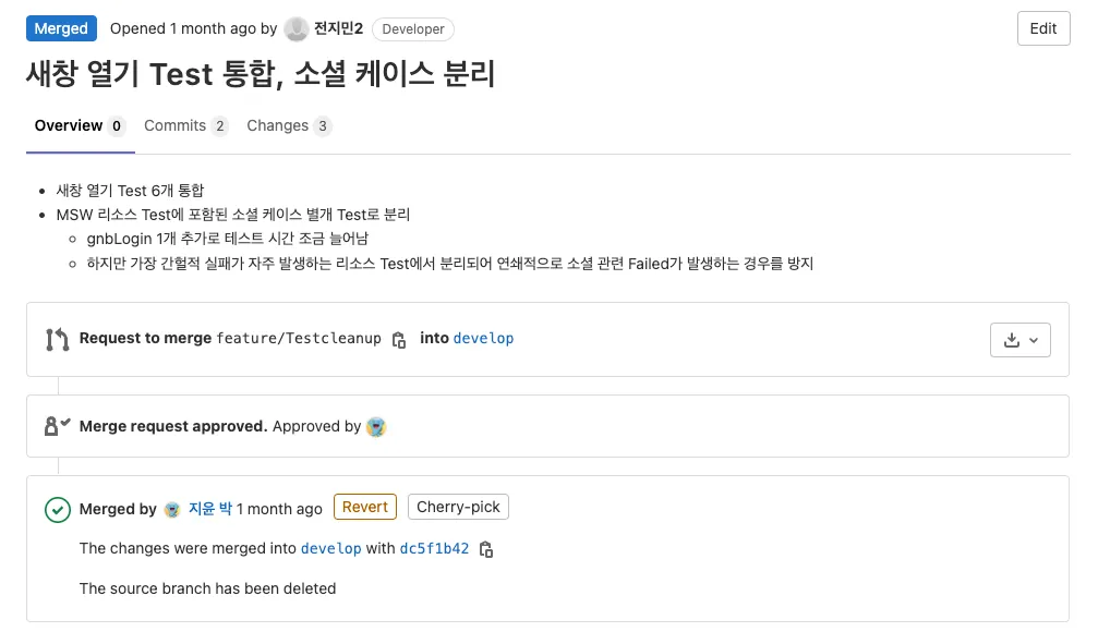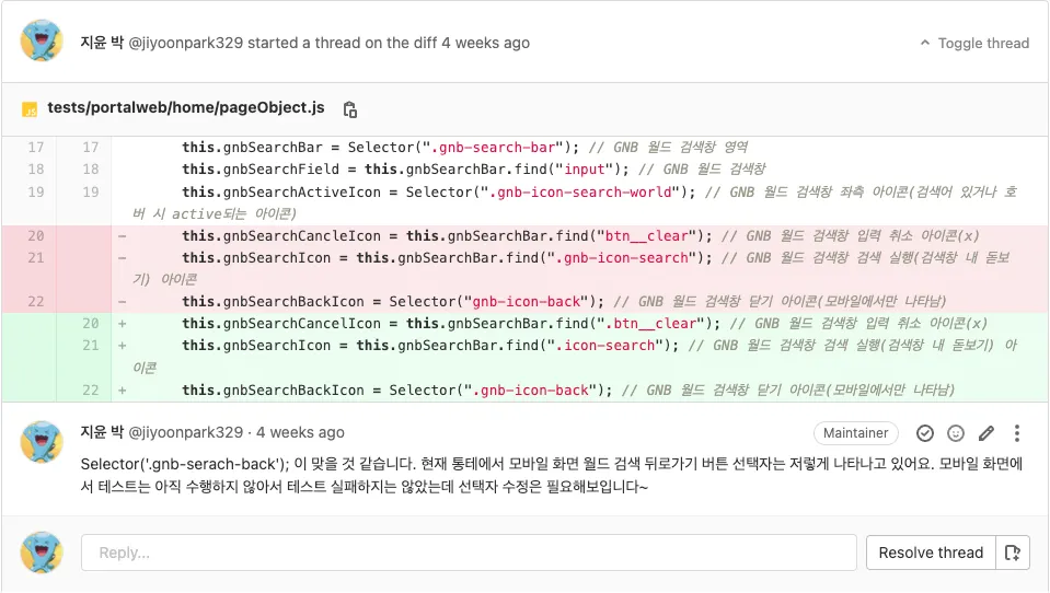 현재는 테스트 코드 자체의 에러나 버그를 함께 살펴보기 위해 개발자가 MR(Merge Request)을 보며 같이 리뷰하며 고쳐가고 있습니다. 곧 소개하겠지만, 라이브러리 자체 버그나 모킹(mocking)된 환경에서 발생하는 cors에러 등의 이슈 같은 문제가 아니라면 점차 QA에서 보다 주도적으로 테스트 코드를 작성하실 수 있으리라 봅니다.