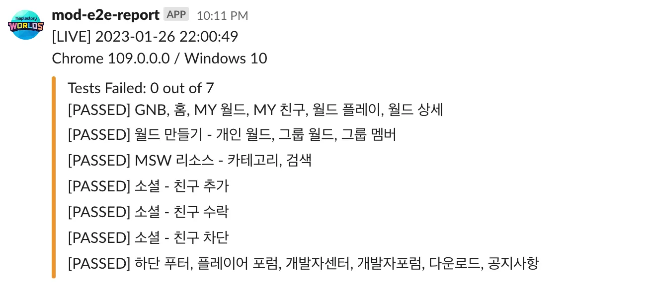 테스트 환경에서 이미 자동화된 공통 테스트가 정상적으로 수행된다면, 실제 라이브 배포 시점과 맞추어 테스트 코드도 바로 업데이트하여 배포할 수 있습니다. 테스트 환경 배포 직후 생기는 여러 문제를 자동 테스트로 더 빠르게 잡아낼 수 있도록 차근차근 다음 단계를 준비하고 있습니다.