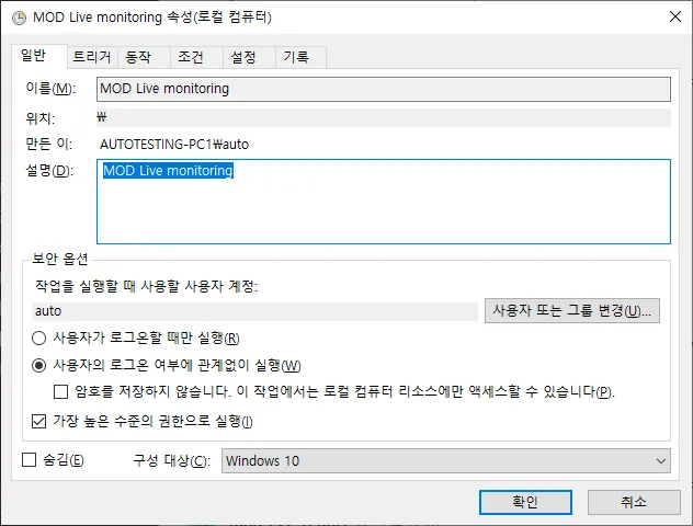 라이브 환경에서 주기적으로 테스트를 자동으로 수행할 수 있도록 세팅했습니다. 넥슨네트웍스 QA 팀의 지원을 받아 모니터링 PC가 설치되었고, 스케줄러 설정 및 자동 실행 스크립트 작성은 우리가 지원했습니다. 이 PC의 윈도우 스케줄러를 통해 1시간 마다 자동으로 타겟 브랜치 master의 코드를 가져와 최신화된 테스트 코드로 테스트를 자동 수행합니다.
