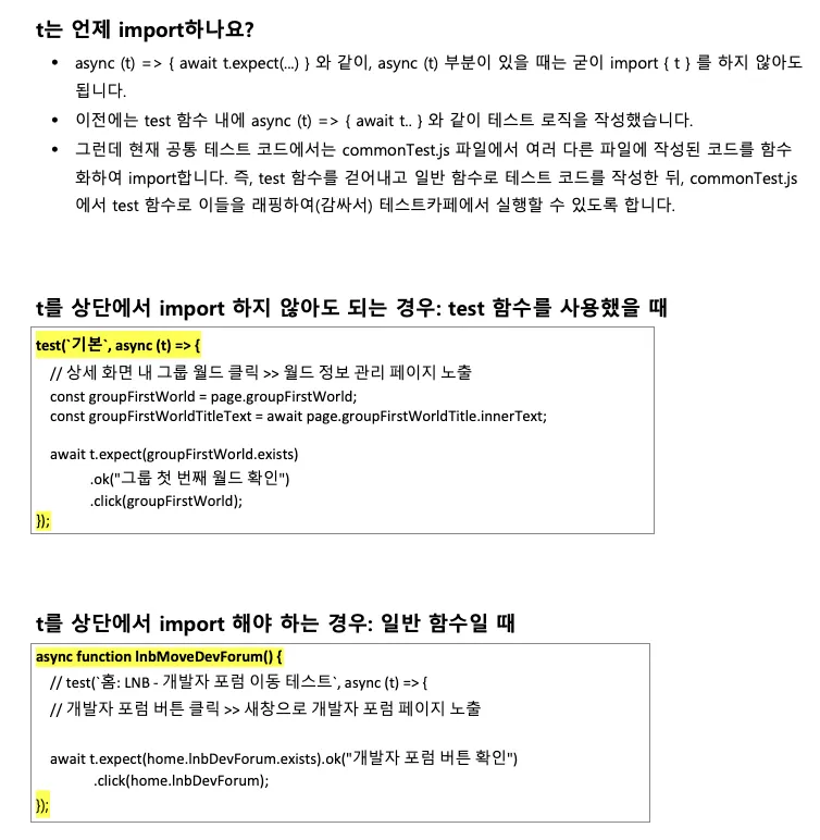 QA 합류 전, 우선 팀에서는 한 번 더 테스트 코드 초안을 다듬고 기초 기능을 설명하는 튜토리얼을 작성했습니다. 필요한 경우 공식 문서 번역도 미리 준비하는 등 러닝 커브를 최대한 줄일 수 있는 밑바탕을 갖춘 뒤 프로젝트 합류를 제안했고 넥슨네트웍스의 플랫폼/웹 QA 담당자 세 분이 프로젝트에 함께하게 되었습니다.