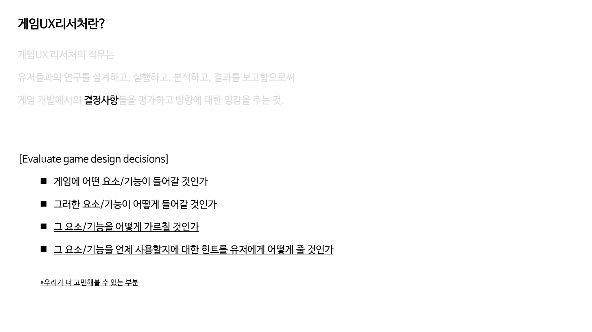 그림 10: 스터디 발표 내용 中 게임UX리서처로서 고민해야 하는 부분