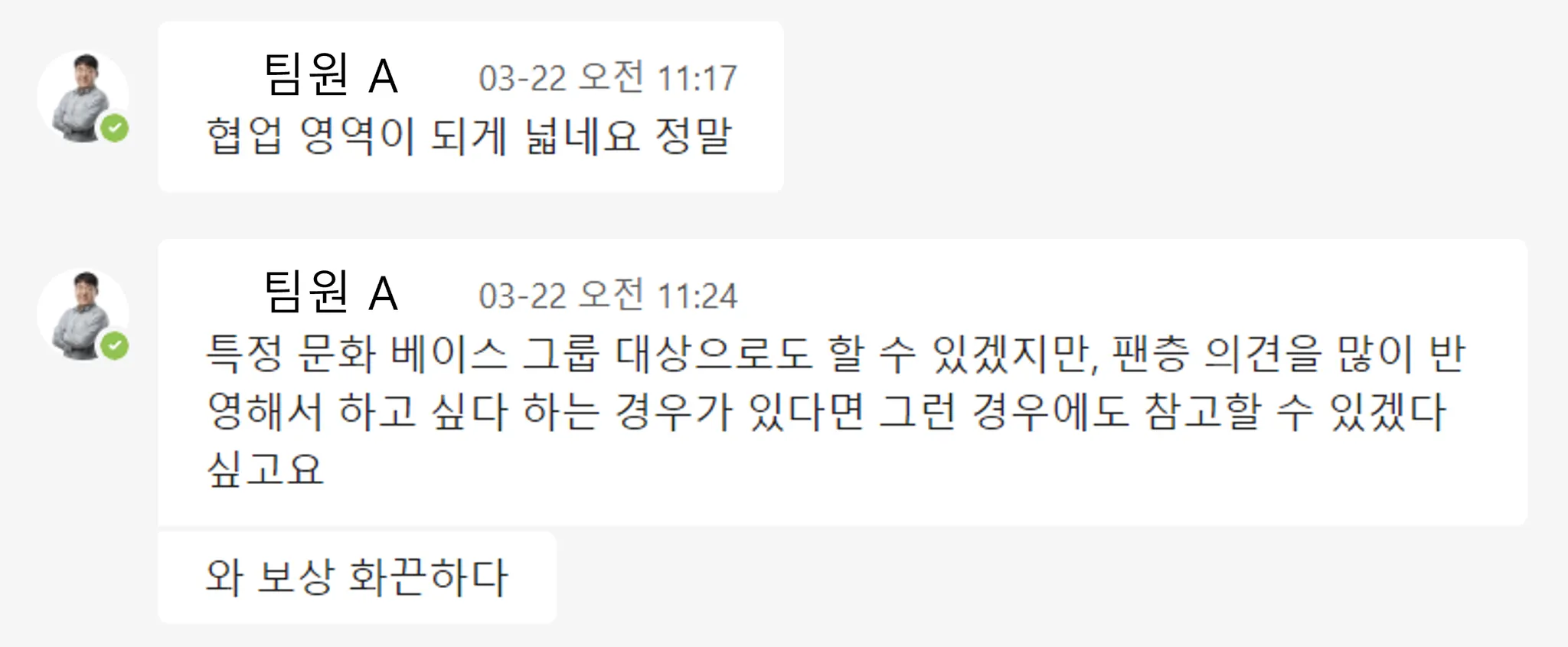 추가적으로 요즘은 다양한 채널에서 양질의 정보를 접할 수 있기 때문에 팀원분들이 일상에서 마주친 저희 업무 고민의 결과와 일치하는 내용의 정보를 공유해주시기도 합니다.