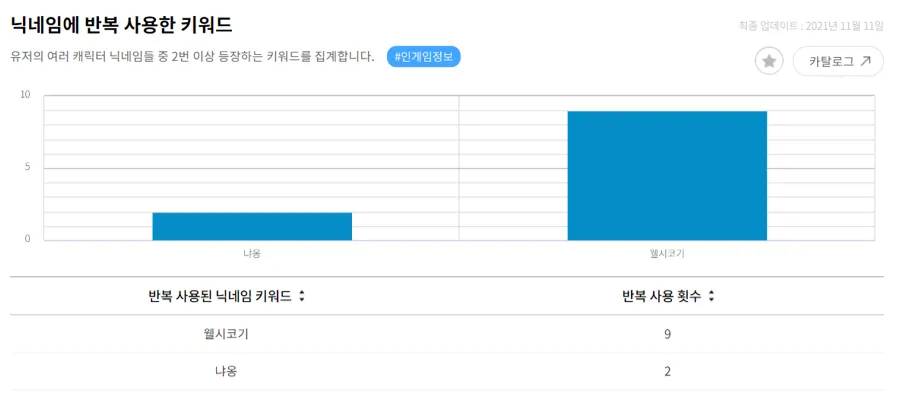 위 유저분은 귀엽게도 웰시코기와 냐옹이라는 단어를 여러 닉네임에 반복적으로 사용하셨네요!
