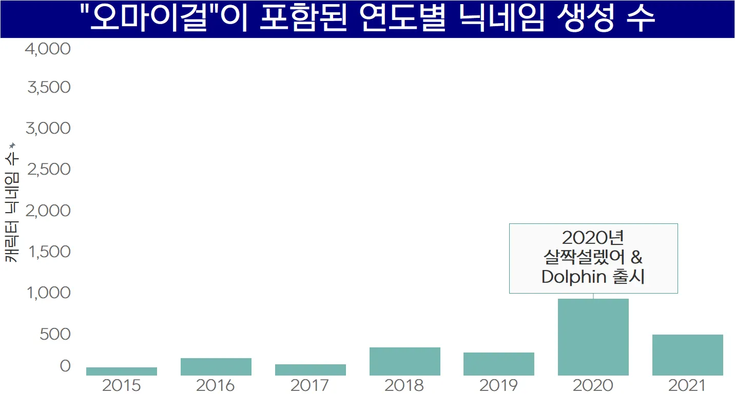2020년, 오마이걸: 데뷔 5년 만에 정상에 오른 걸그룹, 오마이걸! 걸그룹 서바이벌 프로그램 퀸덤을 시작으로 시작된 오마이걸의 인기는 2020년 신곡 "살짝 설렜어"와 "Dolphin"까지 이어졌는데요. 이를 증명하듯 2020년에 가장 많은 닉네임이 만들어졌습니다.