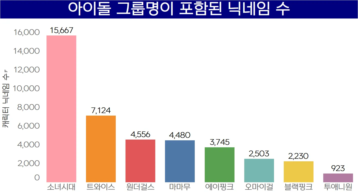 2021년 11월 11일 기준, 넥슨 전체 게임 대상으로 총 8개의 2-3세대 걸그룹 명을 포함하고 있는 닉네임들의 수를 집계한 결과입니다. 그 결과, 소녀시대가 압도적 1위를 차지했는데요, 소녀시대 팬들의 두터운 최애 그룹 사랑이 느껴집니다.