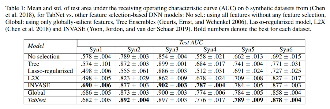 Table 1의 feature selection 모델과의 비교를 보시면 INVASE와 비교되는데, INVASE는 2개의 모델로 구성된 actor-critic 모델이고 파라미터 크기는 101k입니다. 반면 TabNet은 1개의 단일 모델로 구성되었으며 파라미터 크기는 Syn1-Syn3에서 26k, Syn4-Syn6에서 31k입니다. 심지어 Poker Hand induction 데이터셋에서는 룰을 거의 완벽하게 학습(99.2%)합니다.