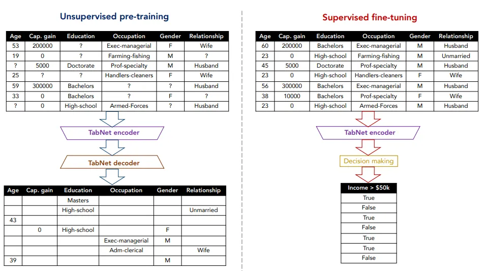 TabNet에서는 레이블이 없거나 결측치가 포함된 데이터셋에서 유용하게 사용할 수 있고, pre-training에도 사용할 수 있는 self-supervised learning을 제안합니다. Encoder의 출력값을 입력받아 feature를 복원(reconstruct)하는 Decoder를 연결한 Autoencoder 구조입니다.