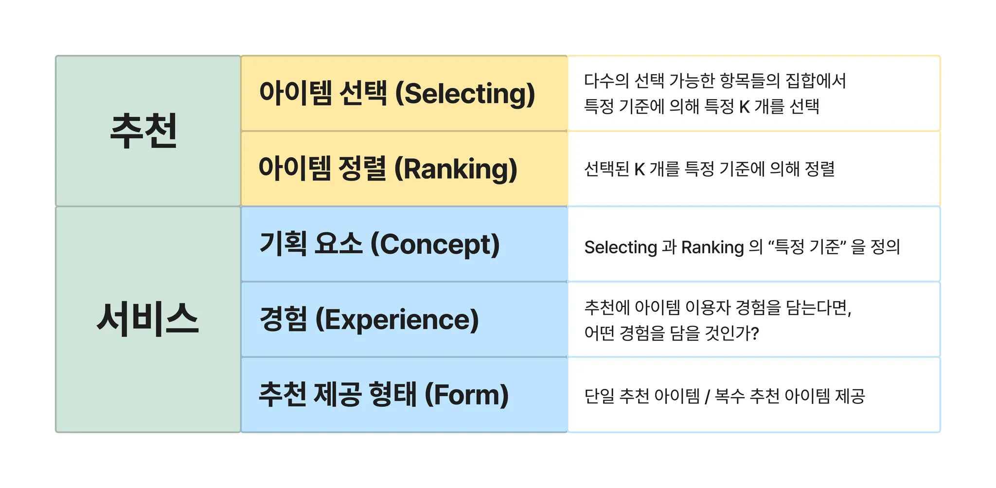 앞서 기술한 추천 서비스의 요소를 가볍게 요약하면 아래의 표로 정리해 볼 수 있을 것 같습니다.