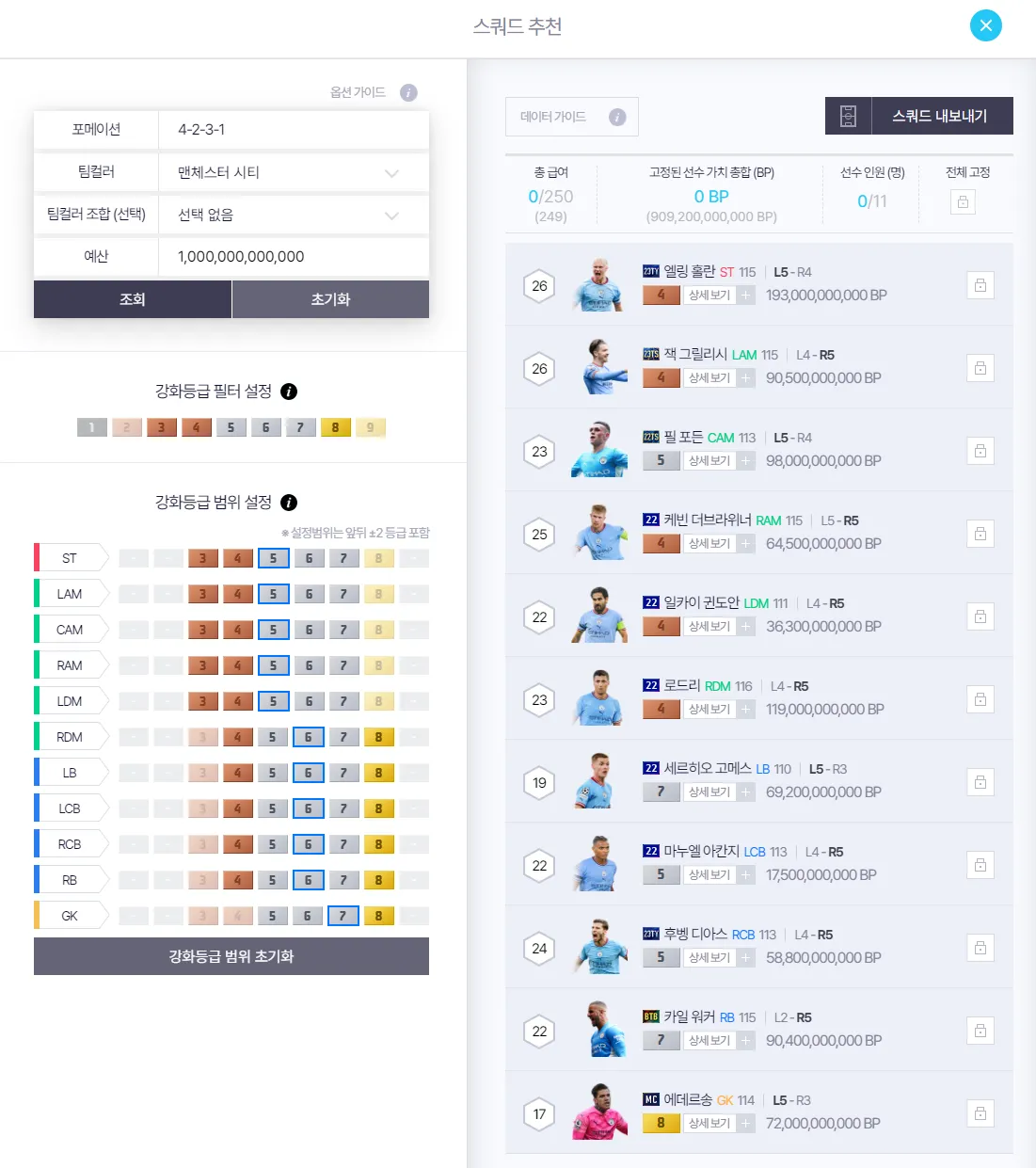 Ex) 맨시티 4-2-3-1 포메이션에서는 {선수 카드 리스트}를 사용한다.