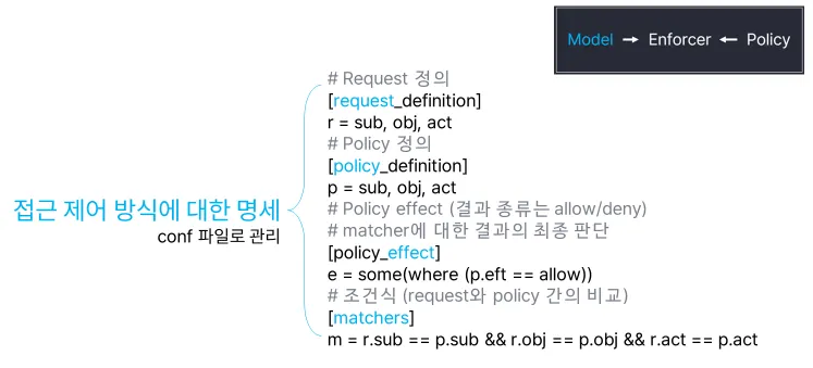 Casbin의 PERM 메타 모델은 크게 request_definition, policy_definition, policy_effect, matchers와 같은 섹션들로 구성됩니다.