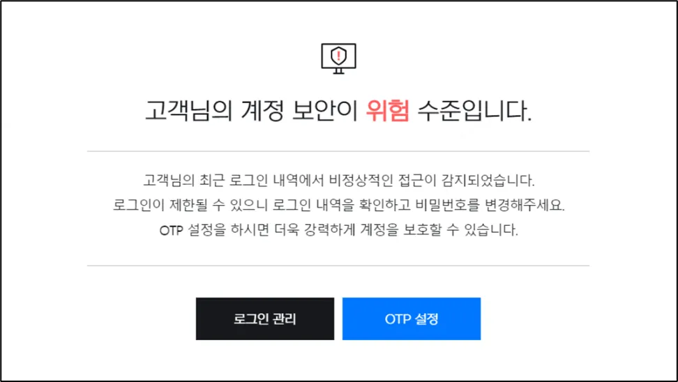 플랫폼쉴드팀에서는 수집한 데이터를 분석하여 보안이 취약한 계정은 “보안위험계정”으로 분류해 관리하고 있습니다. 이렇게 분류한 계정의 피해를 사전에 막기 위해 로그인 시 팝업을 띄워 비밀번호 변경 및 OTP 설정을 유도하고 있습니다.