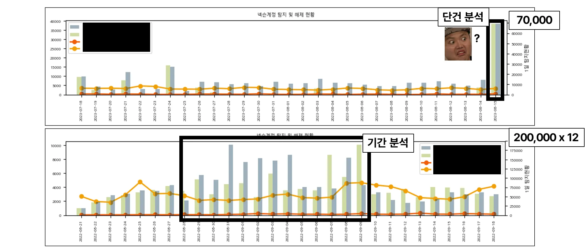 어느 날, 보안위험계정 탐지 건수가 평소 대비 몇 배로 급증했다는 알림을 받게 됩니다. 담당자는 평소 대비 급증한 탐지의 원인과 그로 인한 영향을 파악하기 위해 보안위험계정 데이터를 추출하고 분석합니다.