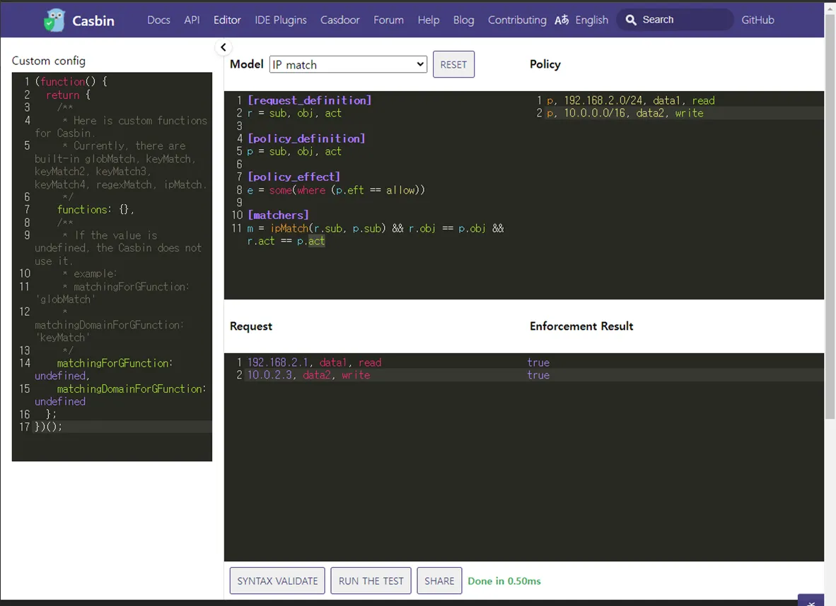casbin은 online editor를 지원하여 코드 구현 없이 온라인으로 접근 제어를 시뮬레이션 해 볼 수 있습니다.