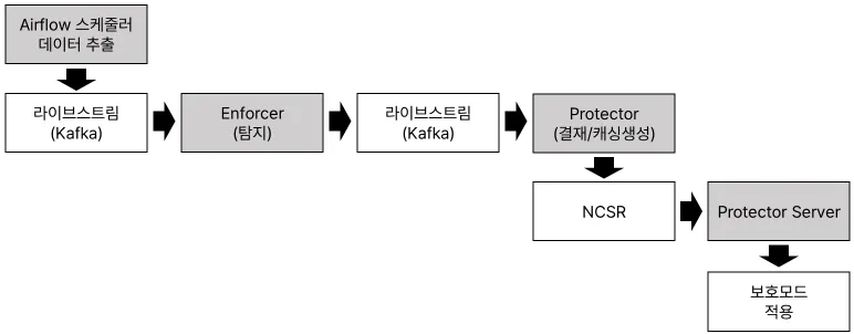 이번 프로젝트를 위해 저희가 직접 구현한 부분은 1) Airflow 기반의 ETL 프로세스, 2) Enforcer, 3) Protector, 그리고 4) Protector Server입니다. 이들은 기능 단위로 분리하여 마이크로서비스로 개발되었습니다. 각 마이크로서비스는 Kafka와 같은 메시지 큐를 활용하여 데이터를 비동기적으로 주고받음으로써, 서로 간의 결합도를 낮추고 단일 장애 지점(SPoF)의 위험을 감소 시켰습니다. 또한, 이러한 구조를 통해 시스템의 수평적 확장을 용이하게 하였습니다.
