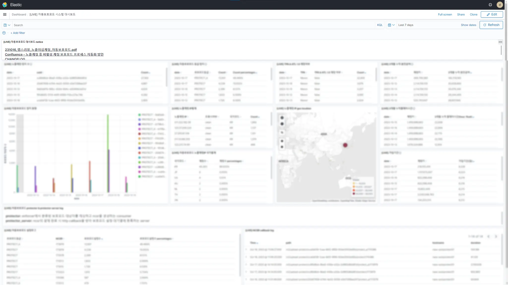 모든 요소는 ELK 스택을 연동하여 Kibana로 대시보드를 용도에 맞게 생성하여 모니터링 하고 있습니다.