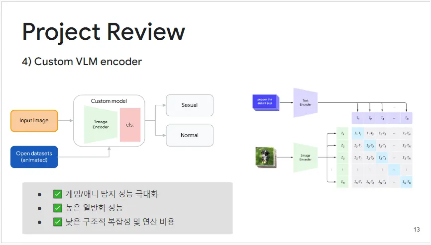 마지막 주요 성과 실험은 이전 실험들에서 확인된 가능성을 토대로 최적의 구조를 개발하여 라이브 서비스에 반영한 메이저 업데이트입니다. 이 구조는 오픈 데이터셋을 활용한 도메인 일반화, 이미지 임베딩을 통한 성능 극대화, 그리고 대규모 데이터로 사전 학습된 비전 언어 모델의 이미지 인코더 사용 등 세 가지 요소를 통합했습니다. 이 커스텀 모델은 파인 튜닝을 거쳐, 실사 도메인과 게임 및 애니메이션 도메인에서 모두 높은 성능을 발휘하는 이미지 탐지 모델로 구축되었습니다.