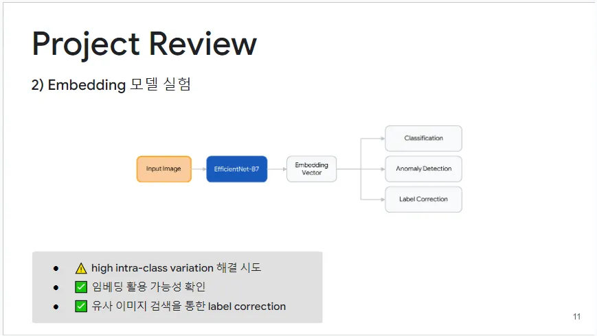 이 실험은 이미지 임베딩을 활용하여 기존 모델의 오탐지 문제를 개선하기 위해 수행되었습니다. 동일 클래스 내 높은 다양성, 특히 음란 클래스에서 분류하기 어려운 데이터의 문제를 해결하기 위해 이미지 모델의 임베딩 부분을 벡터 인코더로 사용하고 이미지 벡터 검색으로 방향을 전환했습니다. 이 접근법은 직접적인 분류에는 성공적이지 않았지만, 이상 탐지와 라벨 교정에 효과적이어서 잘못 라벨링된 데이터를 정정하는 데 큰 성과를 거두었습니다. 또한, 다양한 모델의 이미지 임베딩을 테스트하며 잘 학습된 임베딩의 활용성을 확인했고, 이는 최종 모델 설계에 중요한 인사이트를 제공했습니다.