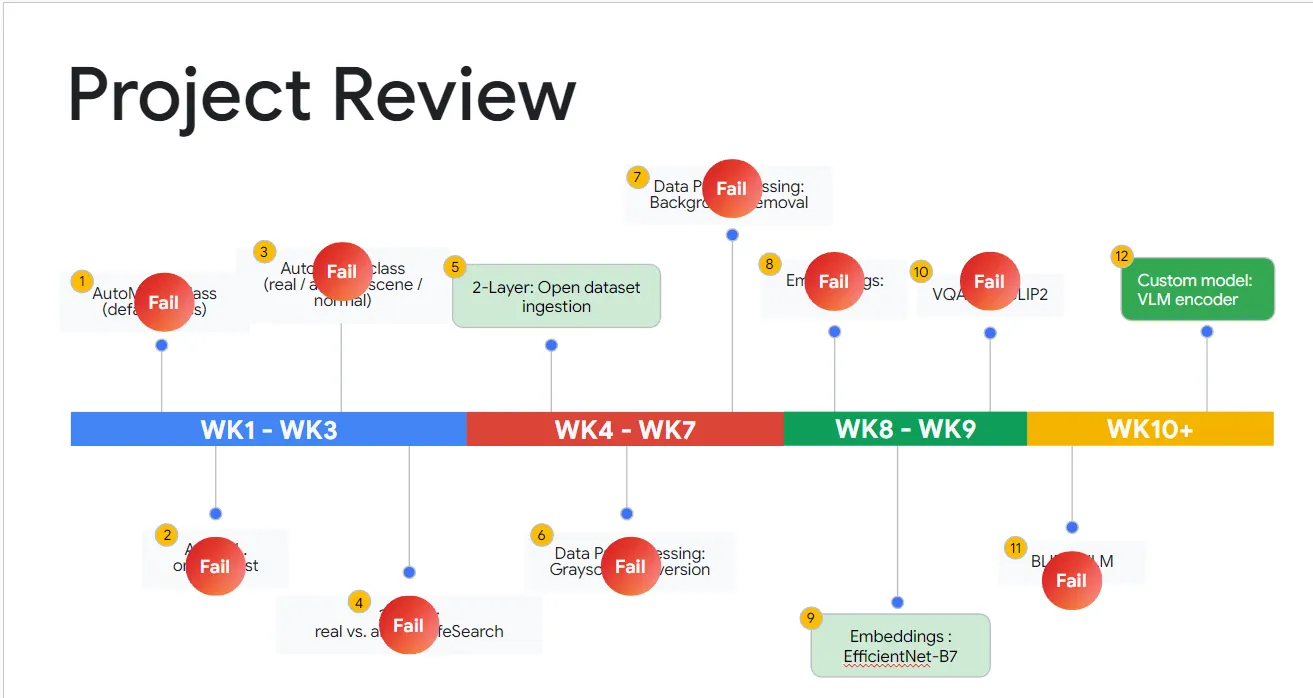 프로젝트는 Auto ML을 사용하여 최적의 파이프라인 구조를 설계하는 것에서 시작했습니다. 이후 데이터 세트 정의를 다듬고, 새로운 이미지 전처리 방법을 시도하는 등 첫 4주 동안 다양한 접근 방식을 모색했습니다. 그 후 더 깊은 모델 실험을 진행했으며, Gen AI를 사용한 비전 질의 응답과 임베딩 벡터 탐색 같은 비전통적인 실험도 시도했습니다.
