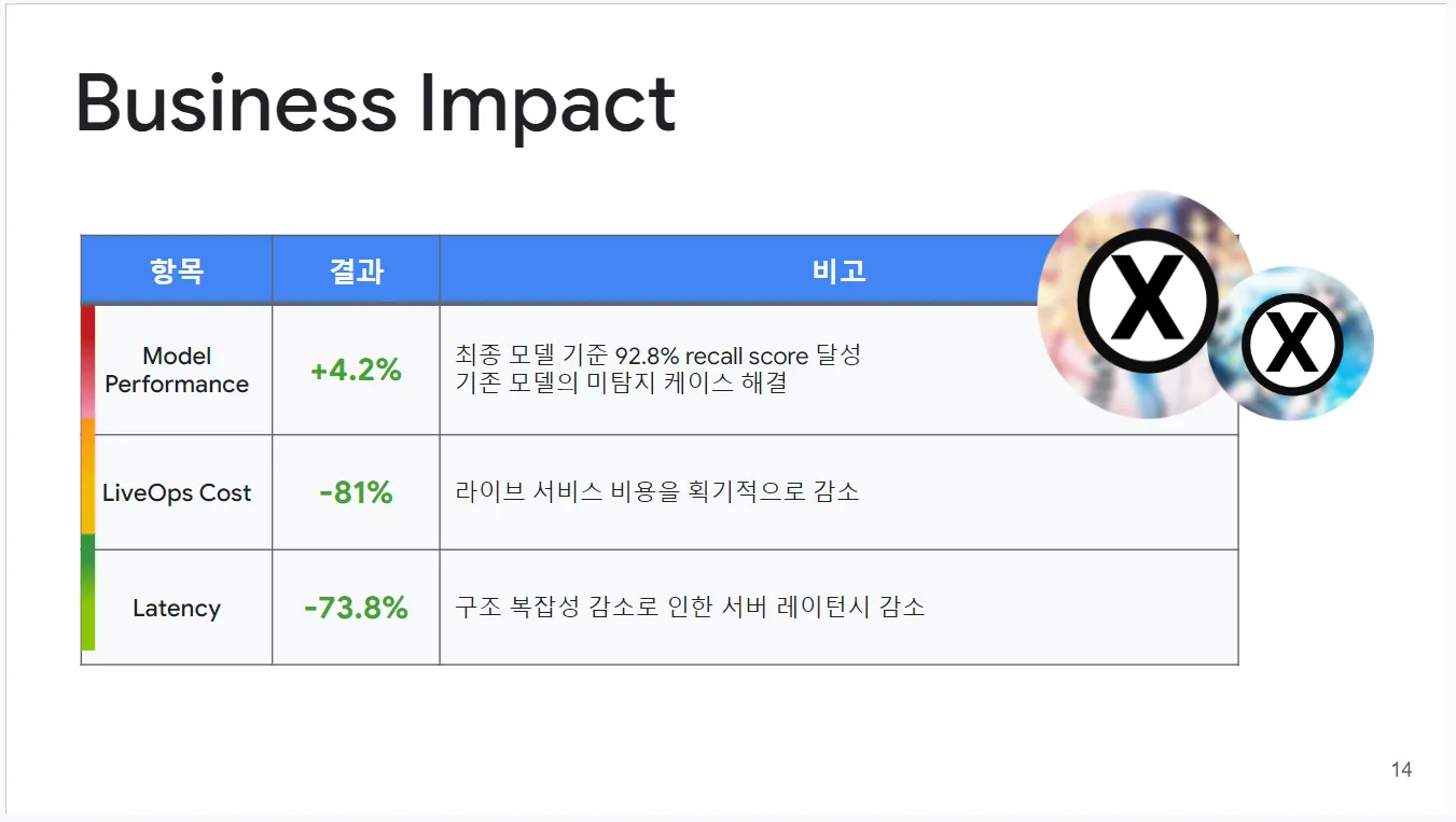 이 협업 덕분에 모델은 이전 모델들이 감지하지 못했던 어려운 사례를 성공적으로 감지하며 성능이 4.2% 향상되었습니다. 또한, 실시간 서버에 통합되어 운영 비용은 81% 감소했으며, 응답 시간은 73.8% 단축되었습니다. 이제 우리는 매우 효과적인 반자동 시스템을 운영 중입니다.