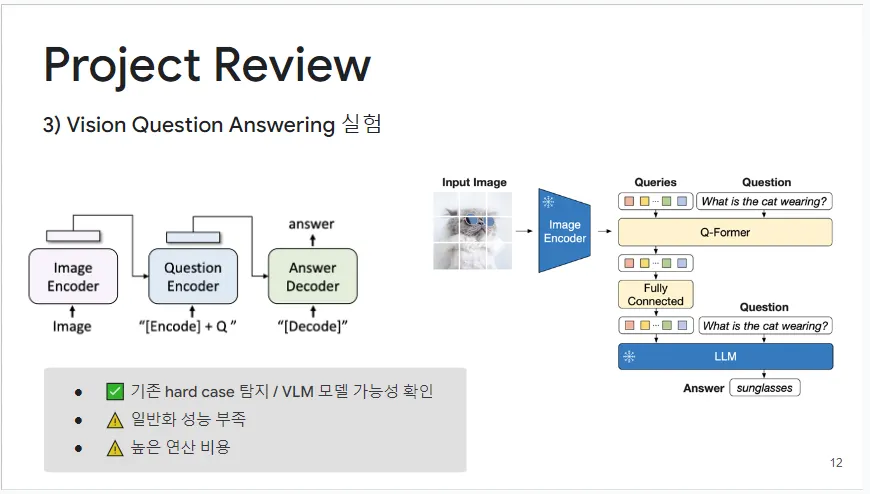 이 실험은 거대 생성 AI를 활용한 Vision Question Answering (VQA) 접근법을 통해 진행되었습니다. 입력 이미지를 인코더를 통과시킨 후, 자연어 질문과 함께 모델에 입력하여 결과를 도출하는 방식입니다. 이 방법을 통해 기존에 해결하기 어려웠던 복잡한 경우(hard case)의 탐지에 성공했고, Vision Language Model의 가능성을 확인할 수 있었습니다. 그러나 이 구조를 전면적으로 채택하기에는 일반화 성능이 미흡하고 연산 비용이 높다는 문제가 있었습니다.